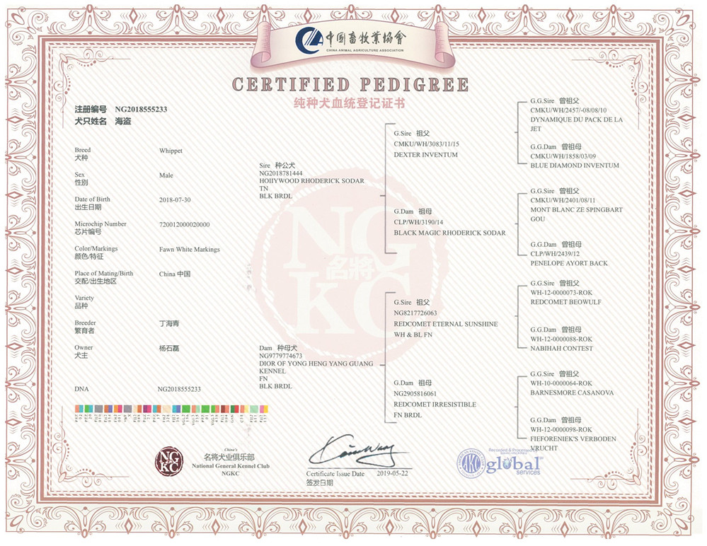 NGKC注册惠比特犬,公犬,2018年7月30日出生于丁海青处,后落户杨石磊处,后落户西平吕鹏飞处