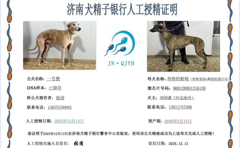 2025年12月13日孟村刘国谦的格力犬种母奇怪的射线使用济南张清的混血视觉犬种公一号狸人工授精