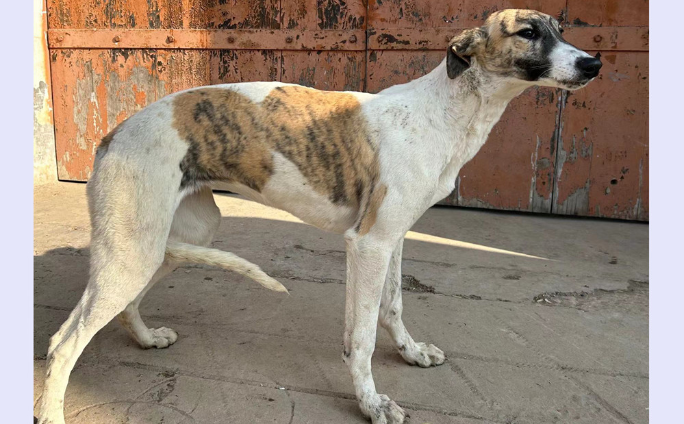 格力犬与惠比特的混血视觉犬,母犬,父亲是惠比特犬酋长,母亲是格力犬飞天,2025年7月出生于永城李小路处