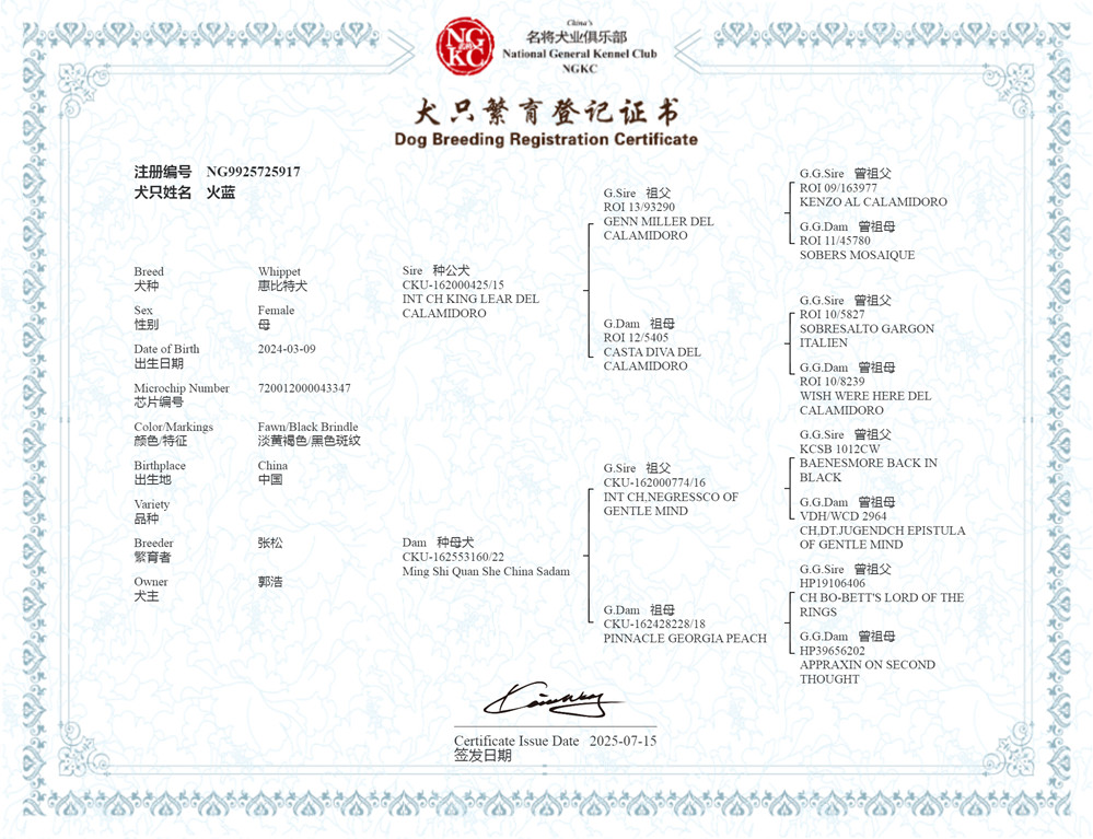 NGKC注册惠比特犬,母犬,2024年3月9日出生于张松处,后落户内乡郭浩处