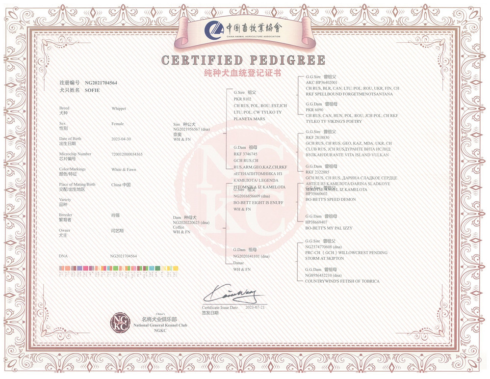 NGKC注册惠比特,母犬,2023年4月30日出生于肖强处,后落户洛阳闫艺翔处