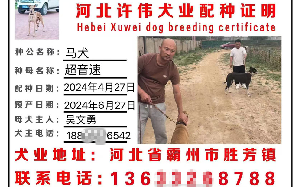 公犬,父亲是一条混血犬名为马犬(详见配种证明),母亲是YY注册格力犬超音速,2024年6月出生于河间吴文勇处