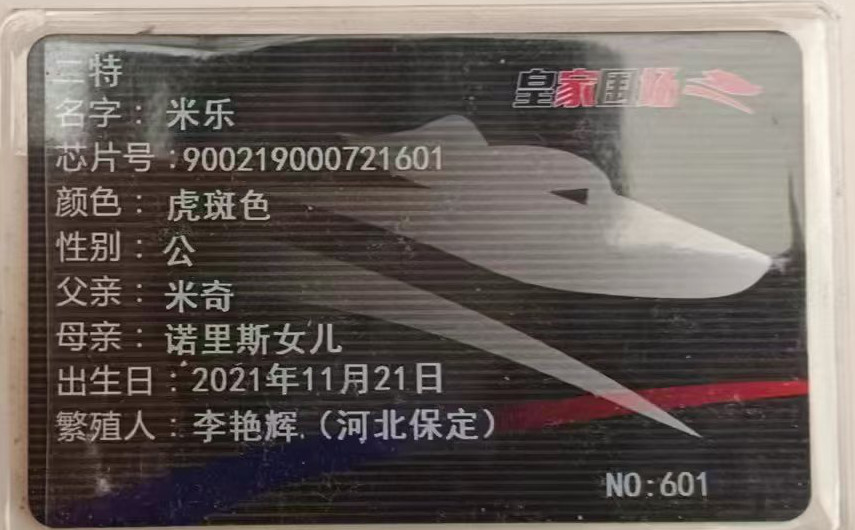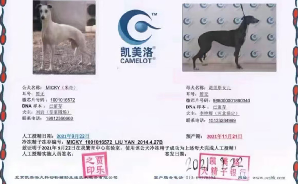 公犬,父亲是惠比特犬米奇,母亲是格力犬黑母988000001880340,2021年11月21日出生于保定李艳辉处,后落户宝坻潘晓峰处