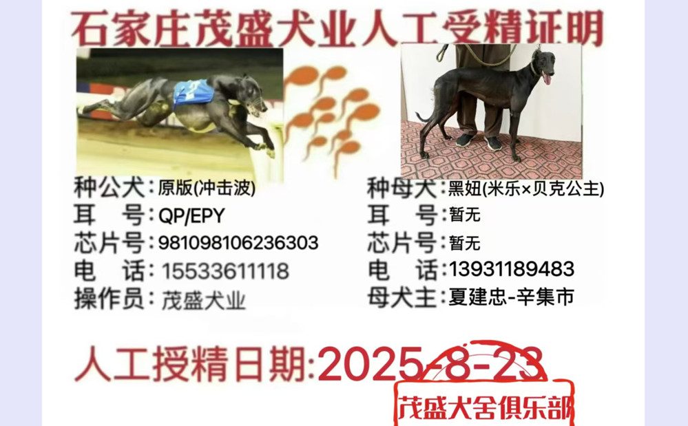 2025年8月23日辛集夏建忠的混血犬种母黑妞使用晋州茂盛犬舍的格力犬种公冲击波人工授精,并于2025年10月产下3条,1公2母