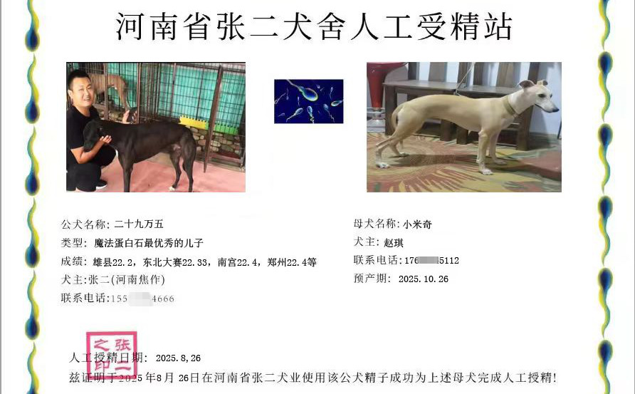 2025年8月26日安阳赵琪的惠比特种母小米奇使用格力犬种公二十九万五人工授精,并于2025年10月产下4条,2公2母